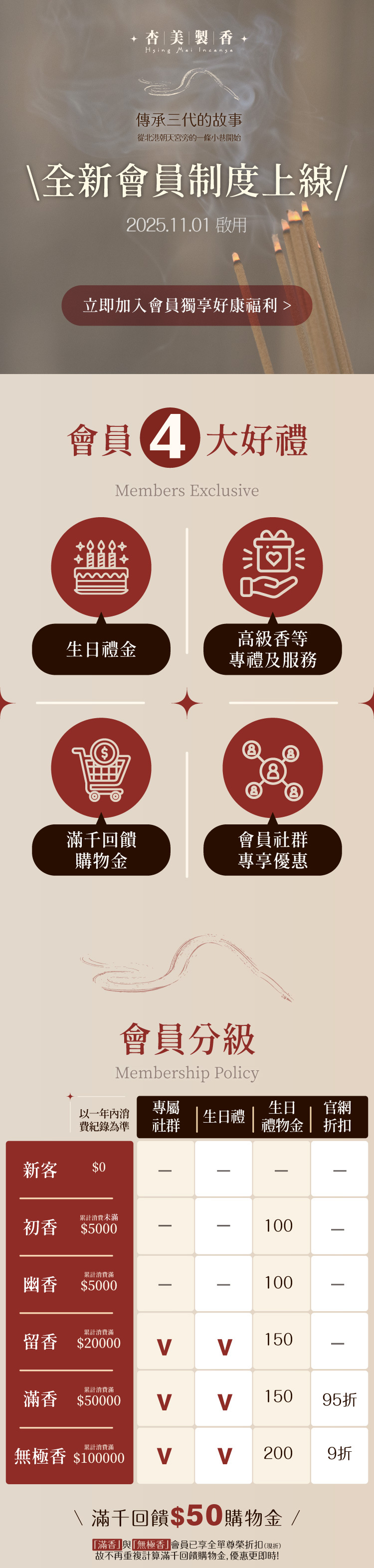 會員制度採累積消費制,會員等級將依上表規定及您的消費紀錄自動調整。