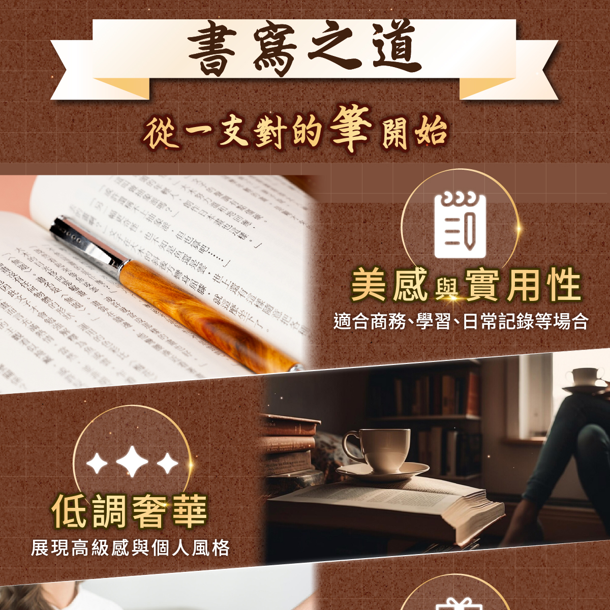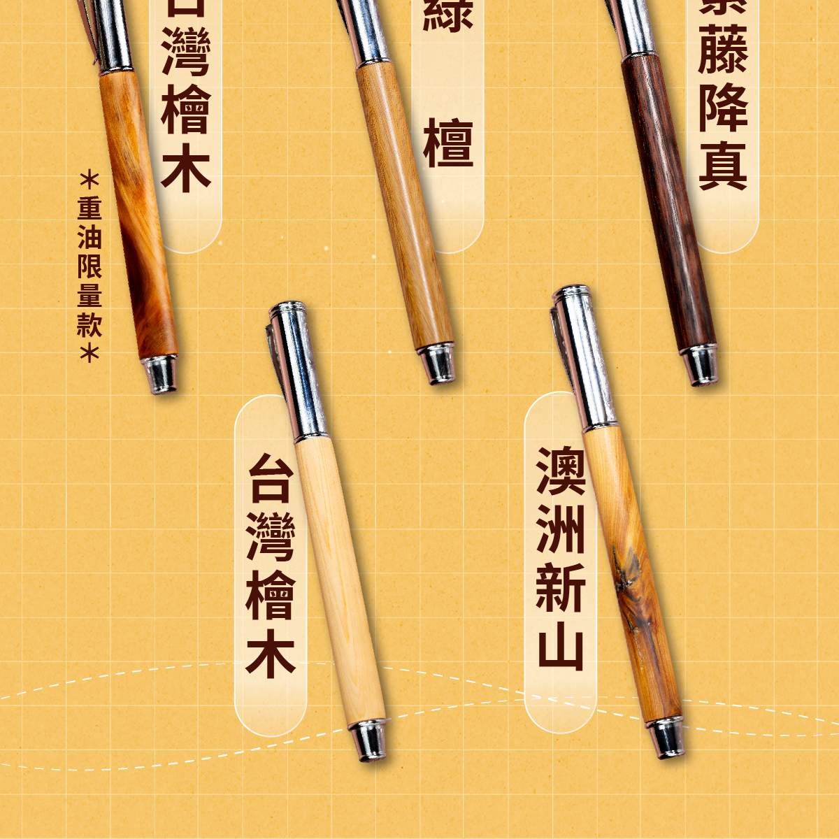 依木材的生長環境、年輪分布與紋理變化,會使每支筆呈現不同的紋路與色澤,
