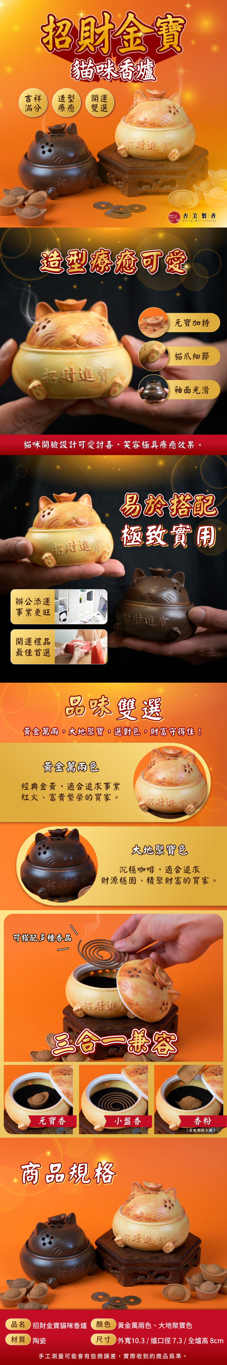 規格品名:招財金寶貓咪香爐