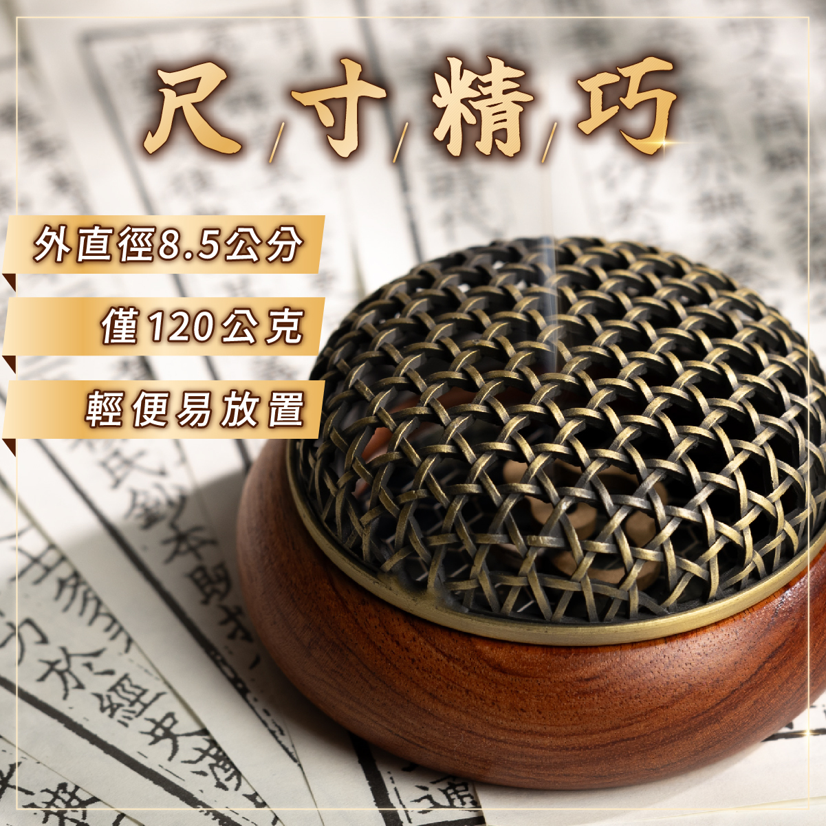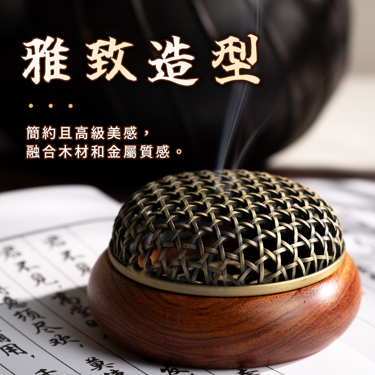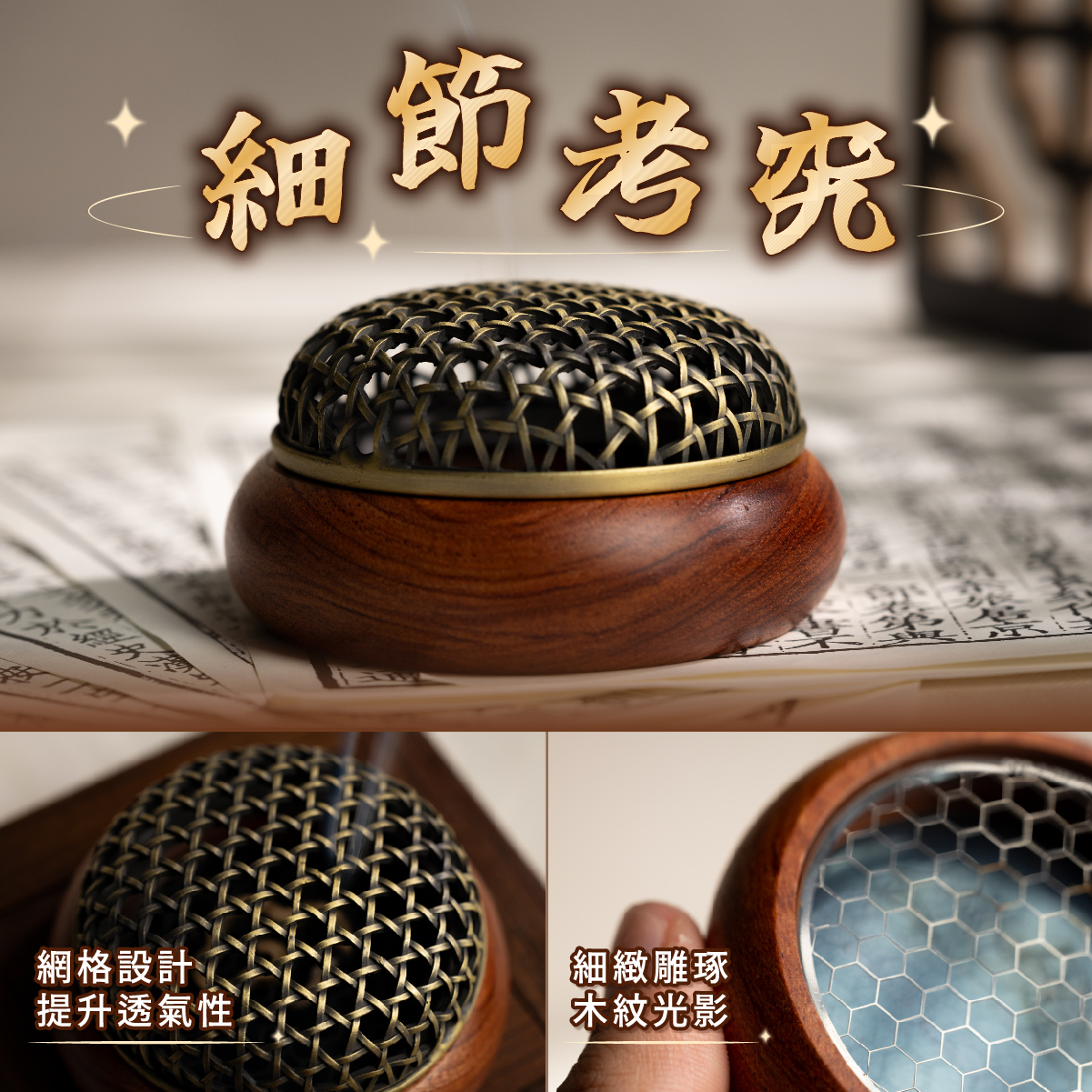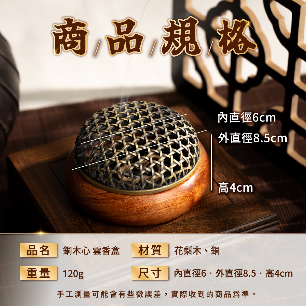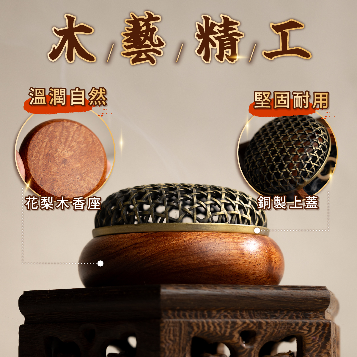 香座基底由花梨木製成,溫潤自然;上蓋為銅製,堅固耐用。